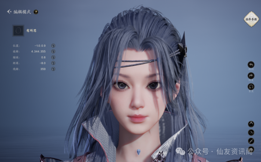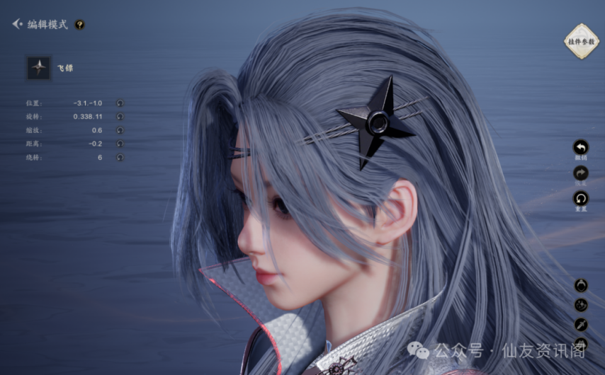 发型选择很飒的长发,染一个蓝色(5个染料就好),挂饰选择的是“有所思”配上一个飞镖(参数如图)。