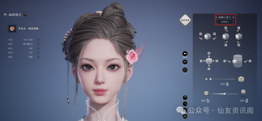 挂件就是简单的选择了一朵玫瑰放在耳边,挂点选择在“头部(左)”,在仔细调整一下。仙友也可以直接用图中参数~