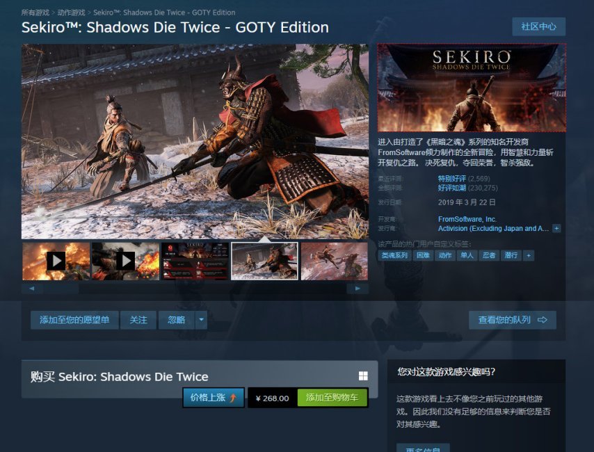 《只狼:影逝二度》于2019年3月22日发售,动视发行,首发登陆了PC,PS4和Xbox One平台。这款游戏荣获当年的年度游戏殊荣,截至2023年9月,其全球销量已突破1000万套。