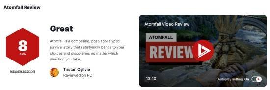 IGN发布对《原子陨落》的测评文章,并给出8分的成绩。短评称:《原子陨落》打造了一个引人入胜的末世生存叙事框架,无论玩家选择以哪条路径探索,游戏世界都会根据其选择与发现进行动态调整,以带来高度沉浸的剧情体验。