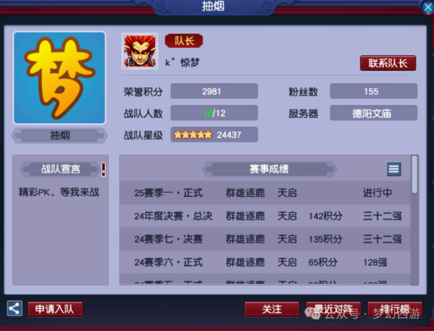 目前最能代表德阳文庙战力的是天启组的“抽烟”战队,在刚刚结束的群雄逐鹿冠军杯中,他们取得了全服三十二强的好成绩。