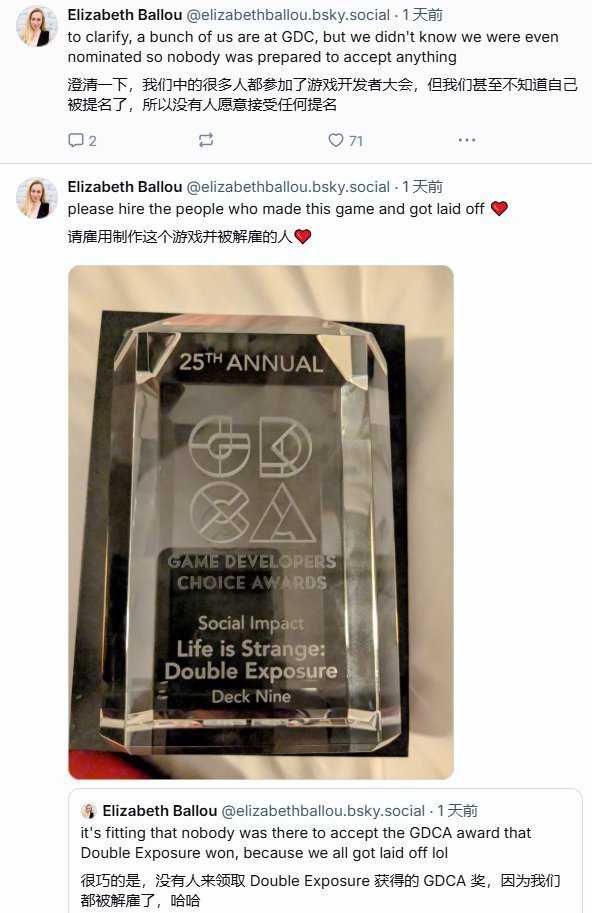 近年来行业竞争异常残酷,这一事件深刻揭示了当前游戏行业的严峻现状。《奇异人生:双重曝光》的叙事设计师Elizabeth Ballou在Bluesky上写道:“没人去领GDCA奖很合适,因为我们都被裁了,哈哈。我们中的一些人参加了GDC,但我们甚至不知道自己被提名了,所以没人准备好去领奖。”