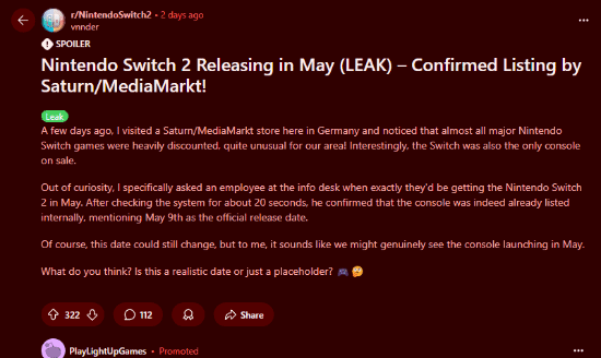 出于好奇,该网友特意询问了店员关于Switch 2具体发布时间的信息。店员在内部系统中查询了约20秒后,确认Switch 2已出现在零售商的商品清单中,并透露5月9日可能是官方公布的发售日期。