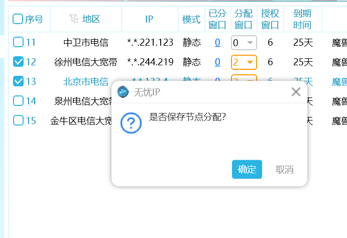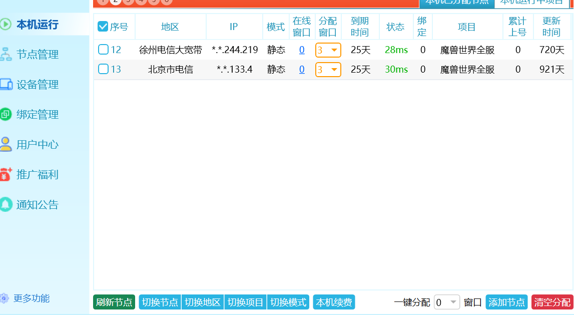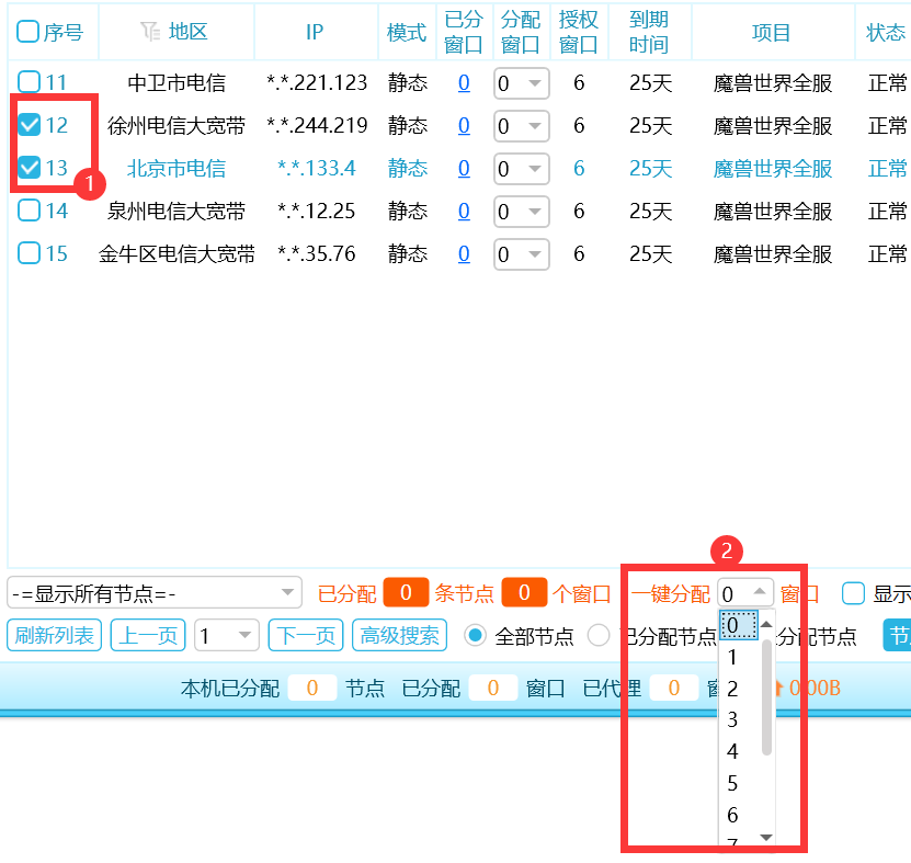 当前电脑需要上4个号,每两个号用一个IP,我们就 勾选2个节点,然后 一键分配 2 个窗口,这样就是每个IP上2个号,2个 IP,总共上4个号。