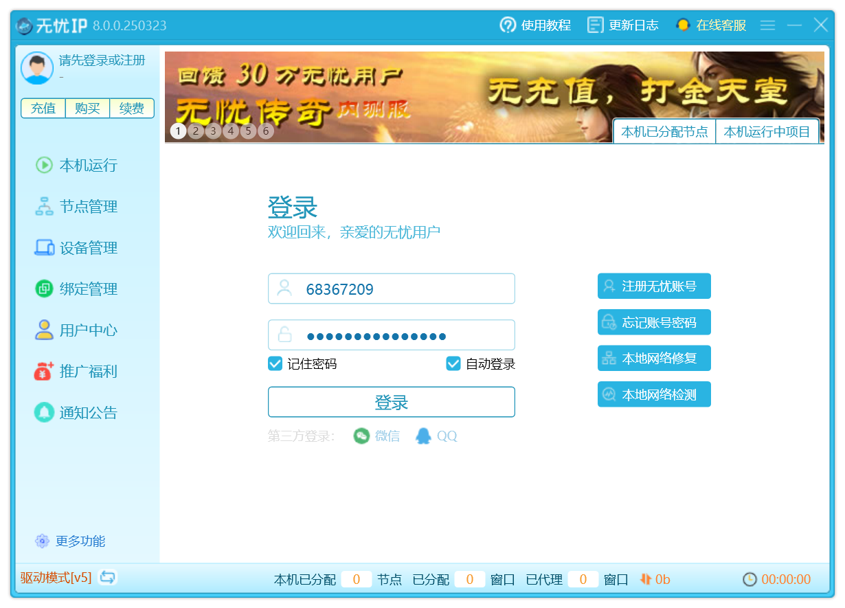 分配好之后,点击本机运行,就会显示当前设备正在使用的节点信息。
