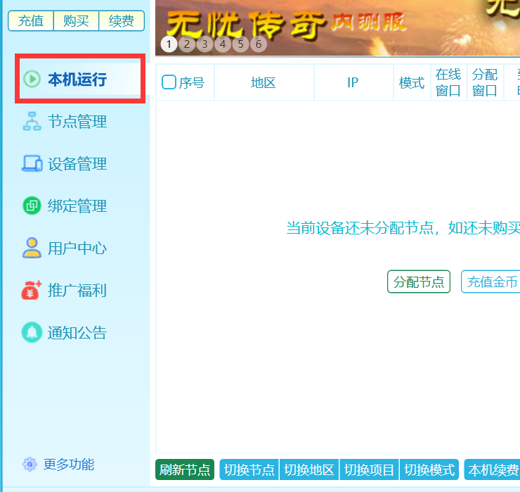 登录后,点击左侧本机运行,可以查看当前设备上已经分配的节点,还未分配节点右边显示的就是空的。