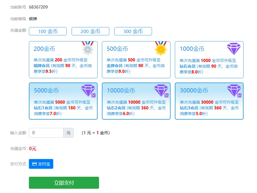 比如:第一次充了 200,接着又充了300,这样只会赠送银牌会员。虽然充了500,但不是一次性冲的,